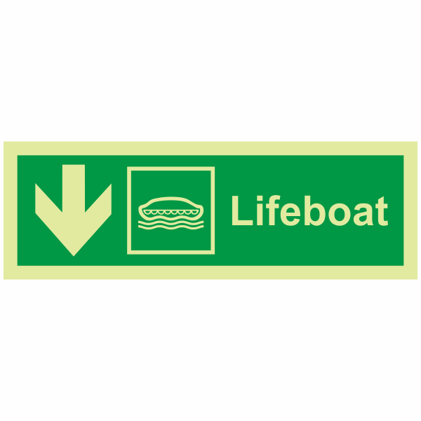 The IMPA 33.4509 Lifeboat Arrow Down Photoluminescent Sign is an essential safety sign used in marit...Full description