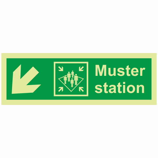 The IMPA 33.4536 Muster Station Arrow Down Left Photoluminescent Sign is a critical safety sign used to direct crew and passengers toward muster stations in maritime environments. The down left-pointing arrow provides clear guidance, ensuring that in...Full description