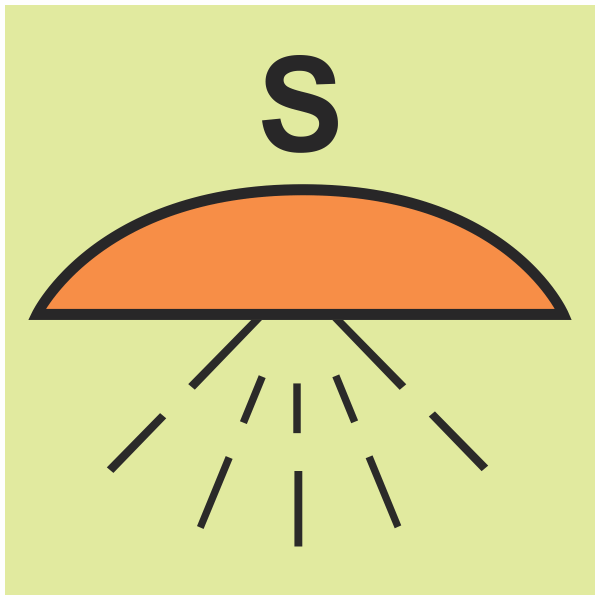 The IMPA 33.6864 Space or Group of Spaces Protected by Fire Extinguisher System Sprinkler Photoluminescent Sign is an essential safety sign used to mark areas protected by a fixed sprinkler fire extinguishing system onboard ships, offshore platforms,...Full description